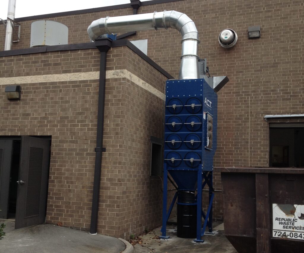 A local company that mixes chemicals for a plastic extrusion process contacted us at Precision Industrial Services to see if we could help them with their house keeping and dust collection project. After viewing their process we went to work to design a system that would effectively and efficiently capture the fugitive dust that was produced by their operations. The first job was to specify the filtration equipment. The chemical dust was a fine powder with a medium dust load volume. We decided to partner with Air Cleaning Technology. We sized a horizontal cartridge down flow dust collector. This style of dust collector has a small footprint, the filters are very easy to change, and the maintenance is very low. We had to take into consideration the characteristics of the dust that we would be collecting. They were using various types of chemicals, some which were flammable so we had to protect the system with an explosion isolation damper in the ductwork and an explosion relief vent on the dust collector.