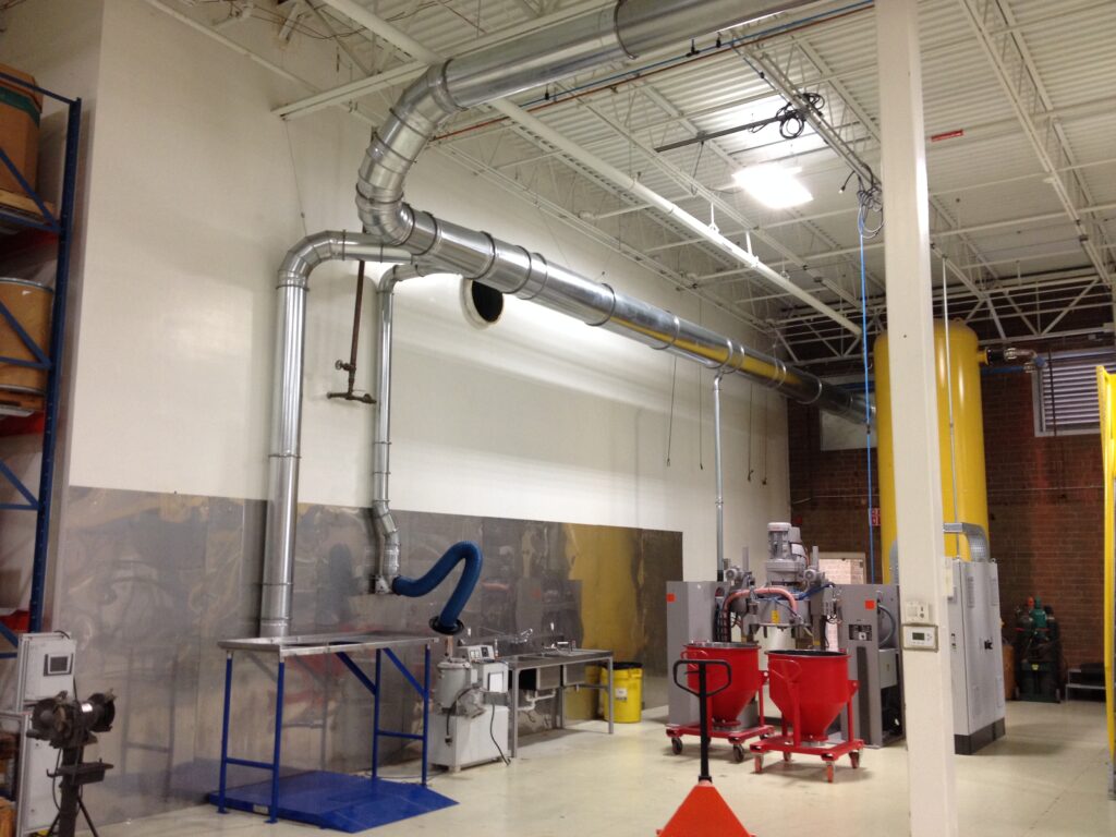 The most challenging part of the ductwork design was underneath the extruder. There were 3 small dust ports to pull from as well as a large area that needed a fume extraction hood and another smaller area, which needed a movable fume extraction arm. All this had to be fit in a small area, but there is always a way to get it done. So we sharpened our pencils and figured out a way to supply the customer with all their wants and needs. The end product was an efficiently designed system that did a great job at keeping the fugitive chemical dust out of the air.