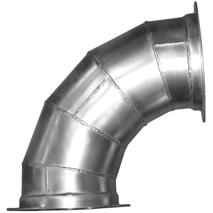 Elbows: Elbows are available in a variety of styles depending upon the diameter, radius (length of turn), and gauge and material required. These include welded halves with a longitudinally welded seam, formed tube elbows, and gore/segmented elbow which are mechanically locked or fully welded to form the elbow. Typical degrees are 90, 60, 45 and 30 degree with standard radii of 1, 1.5 and 2.5 x Diameter. BUT ALL DEGREES AND ALL RADII ARE AVAILABLE. Elbows are typically two gauge heavier than the duct.