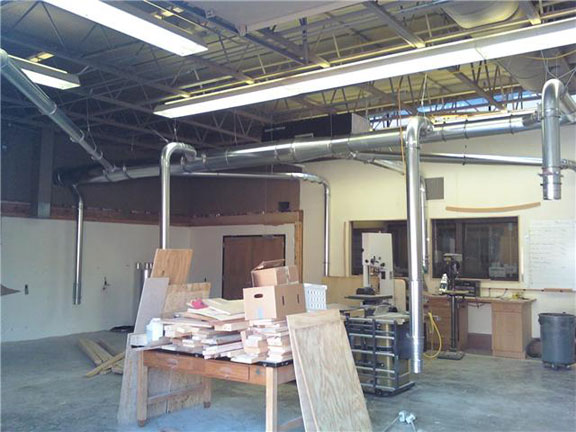 Once the dust collector was installed outside, we turned our attention to the machine placement and ductwork installation inside. The customer had changed some of the desired locations of the machinery positions. The onsite engineer from Precision Industrial sat down with the customer and a list of all the ductwork that had been ordered. They were able to change around some of the branches and elbows to accommodate almost all of the changes requested. Only a few parts had to be ordered to accommodate the rest of the changes. The customer was satisfied and only had to purchase a few extra fittings. The clamp together style of ducting that was used made it easy to change the layout on the fly. It also made the installation fast saving on labor cost. In the end, this university has a clean and safe wood working shop for its students to use and enjoy.